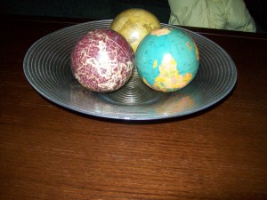 Apparently these coasters are unaware of which home they got adopted into. Perhaps they’re as blind as me. But that’s alright, I’ll take the compliment from this mass manufactured piece of paper that goes to all sorts of people with horrible taste and I’ll believe it. That’s what faith is, after all. I didn’t stop with the coasters. I bought a centerpiece. Have I ever told you about my globe obsession? I haven’t? Wow – I guess not everything I say is a rerun (until tomorrow when I talk about this again).