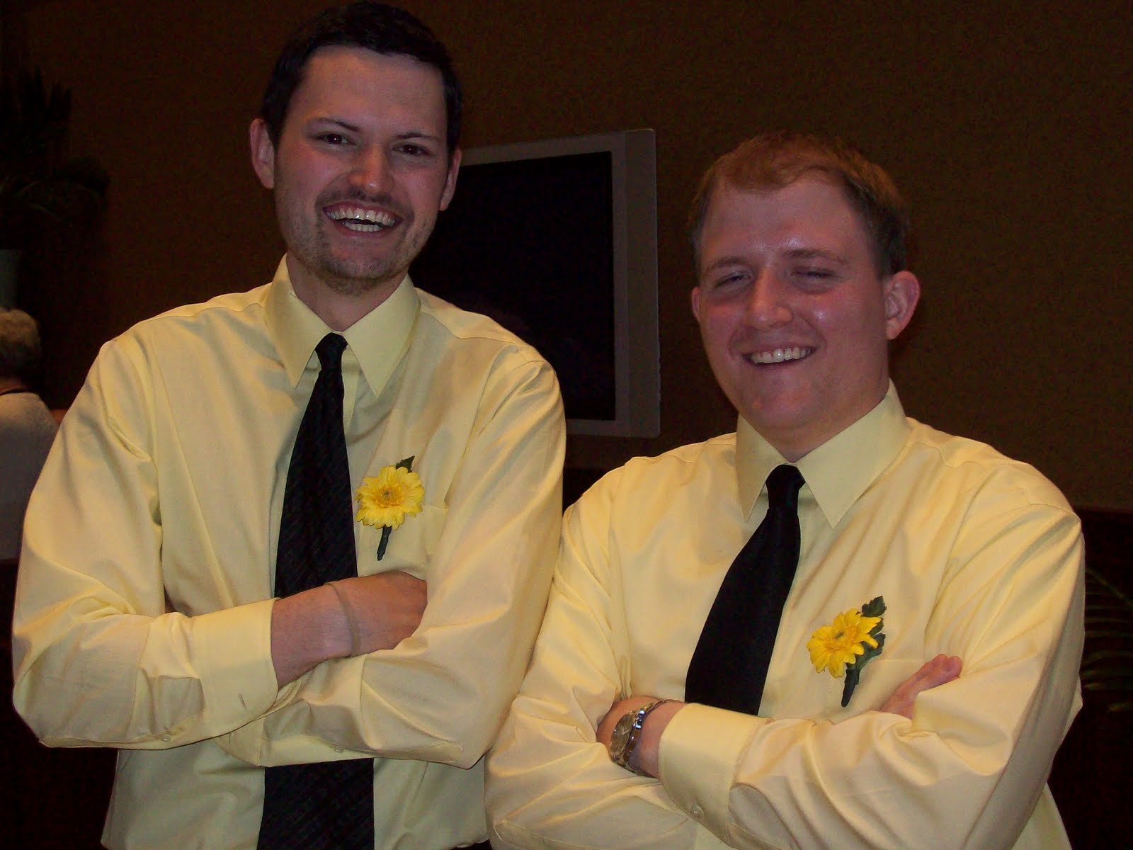 OK, I knew you were curious now about how hideous this shirt was. These are the groomsmen in all their piss yellow glory. I’m just thankful I didn’t have to wear it. I only wear four colors: black, white, gray, and blue.