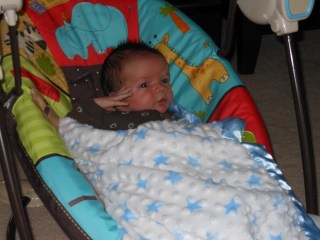 Over his lunch break, Steve ran out and got Brandon this swing chair. This swing chair allowed me to make breakfast and unload the dishwasher this morning. I’m hoping this afternoon I can make the bed and take a shower and do my pilates video. The chair did eventually get Brandon into his napper.He hasn’t slept in there for days. I’ll take what I can get. But I want the old Brandon back!