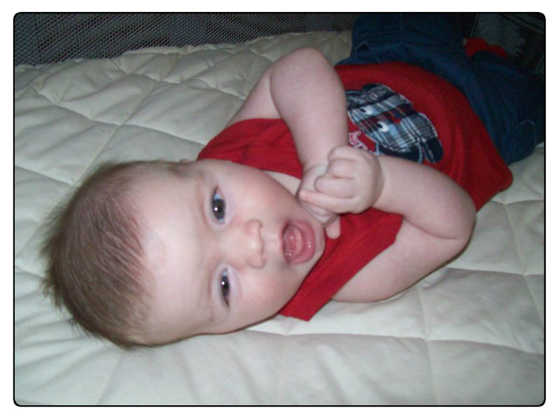Hope you all had a Happy 4th of July. July 4th marked 3 months from Brandon’s birthday. We weighed and measured him for his baby book. 16.2 lbs, 26 inches. It’s hard to believe he used to be half this weight. I’ve struggled with him being in daycare a little. He has a cough now, which of course we’re blaming on daycare. But the other day, I left his diaper bag in the car and when I came back into daycare to leave it for him, I saw him gripping a rattle. I didn’t know he could hold things in his hands until I saw that. Maybe they are doing something right at daycare, after all.