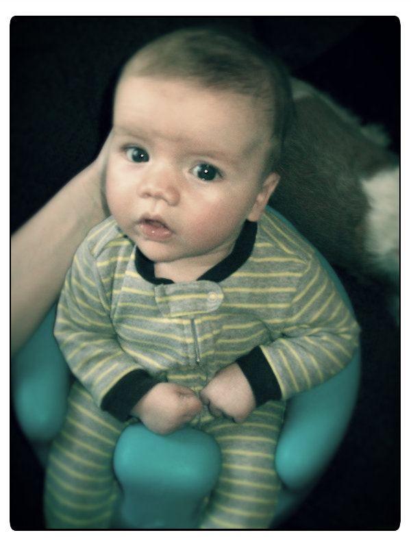 A co-worker of mine has a four-month old nephew. He’s always showing me pictures of him. One of the pictures has the nephew sitting in a Bumbo seat all by himself. Of course I got all competitve and thought maybe my three-month old could do the same thing. I bought a Bumbo seat and placed Brandon in it. He liked it, but can’t quite support his head all by himself yet. One day I’ll post a picture without my arm in it.