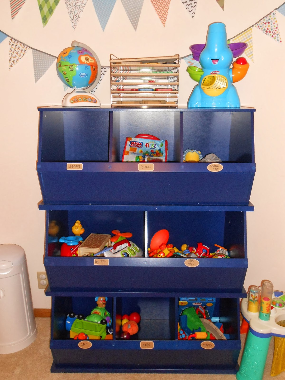 I assembled the toy bins, then I labeled them, then I went to Michael’s and bought craft supplies and hung up the flags I made. Brandon points at them and says, “pretty, mama.”