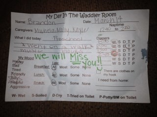 So now, I will try my best to give Brandon the variety of activities he got at daycare. I will arrange play dates for him and take him to the park so he can still interact with kids his age. And I wrote Jackson’s mom a somewhat pathetic note begging her to call me so Jackson and Brandon can still see each other. It’s the end of an era. And what I learned is that daycare isn’t the enemy. Staying home with your kids isn’t a curse. We all do what we need to for our families. And Brandon and I are moving from one era into the other. Hopefully seamlessly.