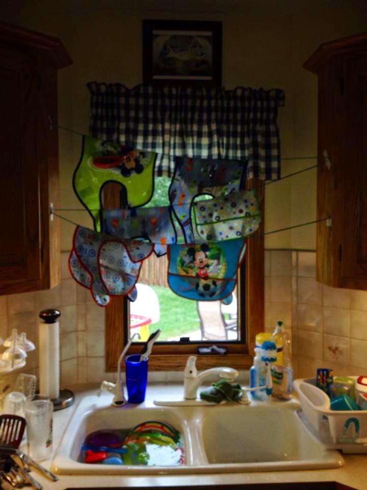 Sure, I’ve gotten a little lazy about it: just washing the one bottle I need rather than the whole sinkful many times, just to need to keep doing that before every bottle. Last week I realized by slacking on the hand-washing, I had run out of bibs so I tied a still slightly damp one around Brandon’s neck and he lost his cool. That was not acceptable. These bibs take forever to dry atop dishes in the drying rack. So I made a bib line. Now my bibs dry very quickly.