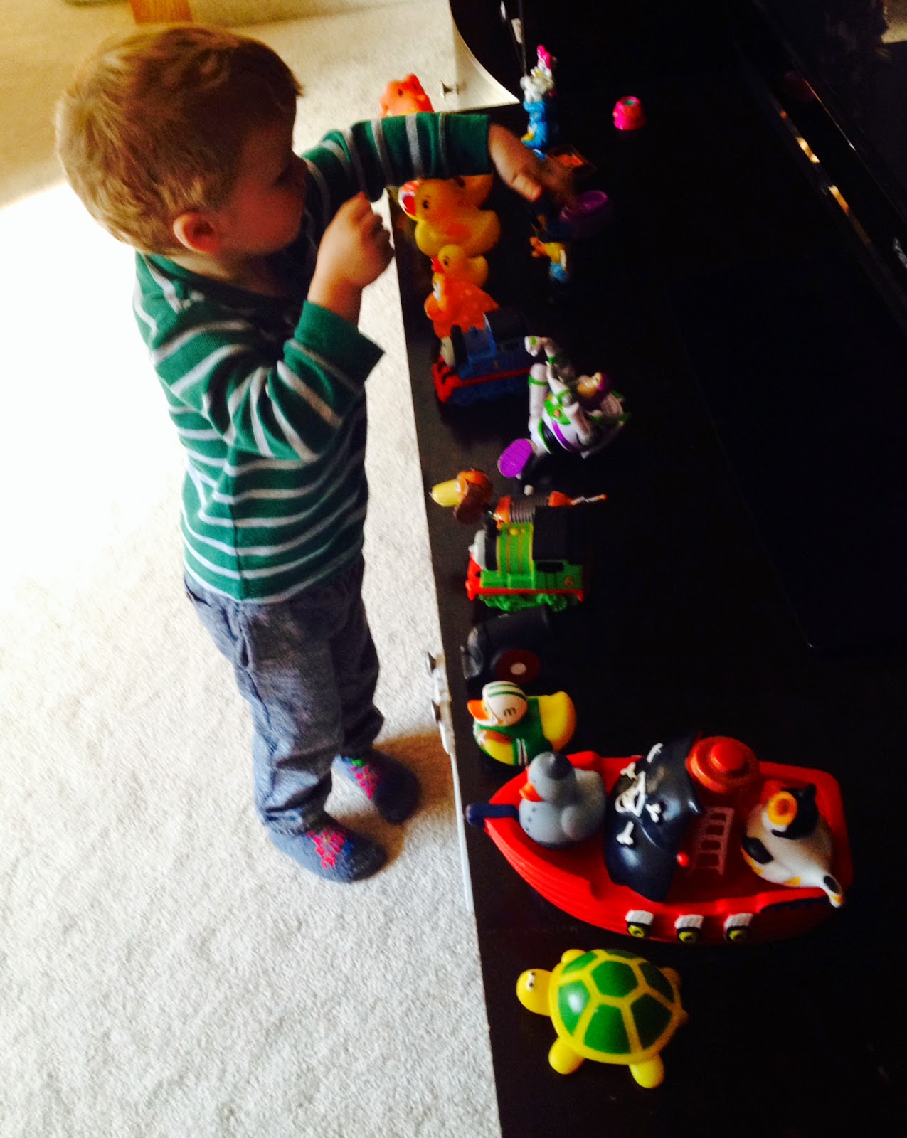 How soon is too early to know that your child has OCD? Brandon spent an hour arranging and rearranging his bath toys into lines. If only he could organize my digital pictures already…