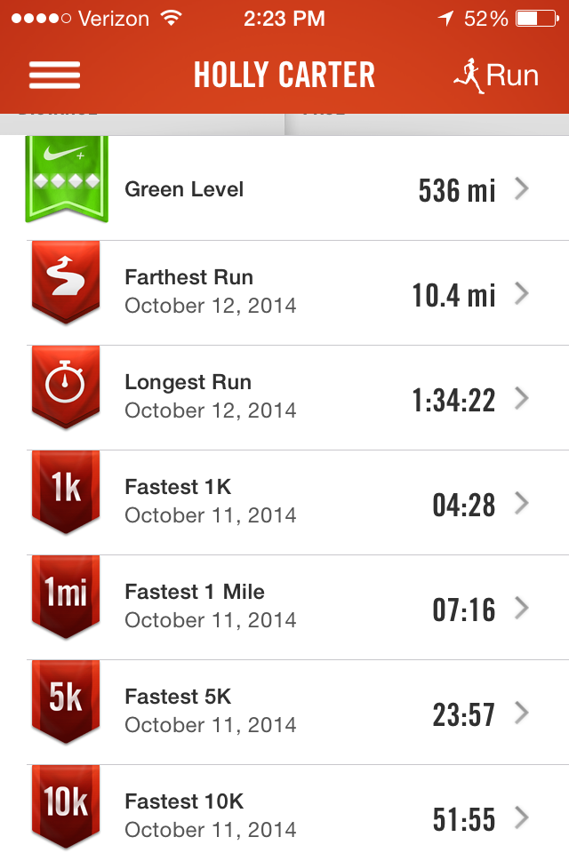 During the week I do short and quick treadmill runs. I still keep that post-it note, “Do Better Than Yesterday” to motivate myself and have been venturing into the six- and seven-something mile ranges on my short sprints. It pays off on my weekend outdoor runs. I PR’d in every category on my Nike+ app this weekend. When I started running without stopping to walk, my fastest mile was 9’03” and now I can do ten miles maintaining that pace. It’s hard to believe what I can do when I actually give a shit.