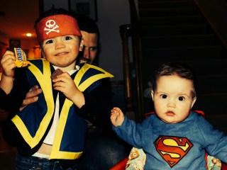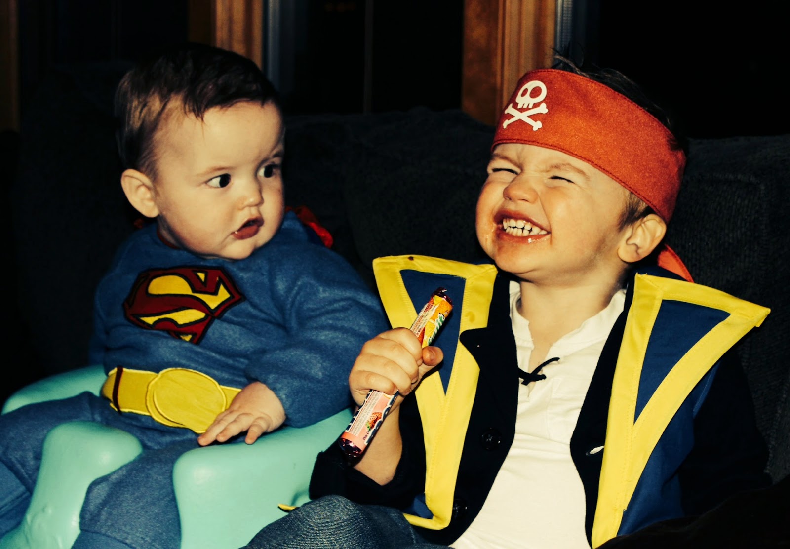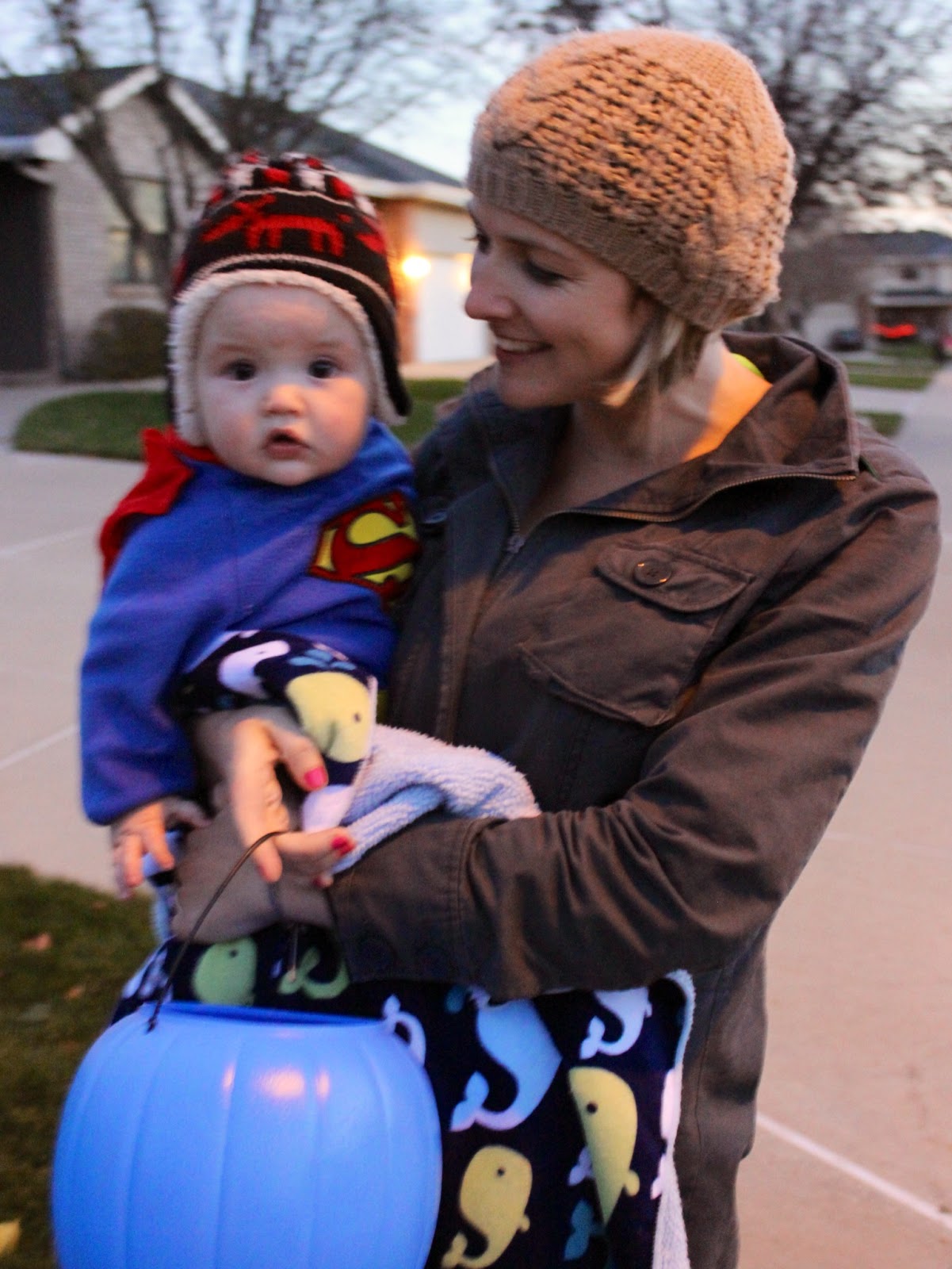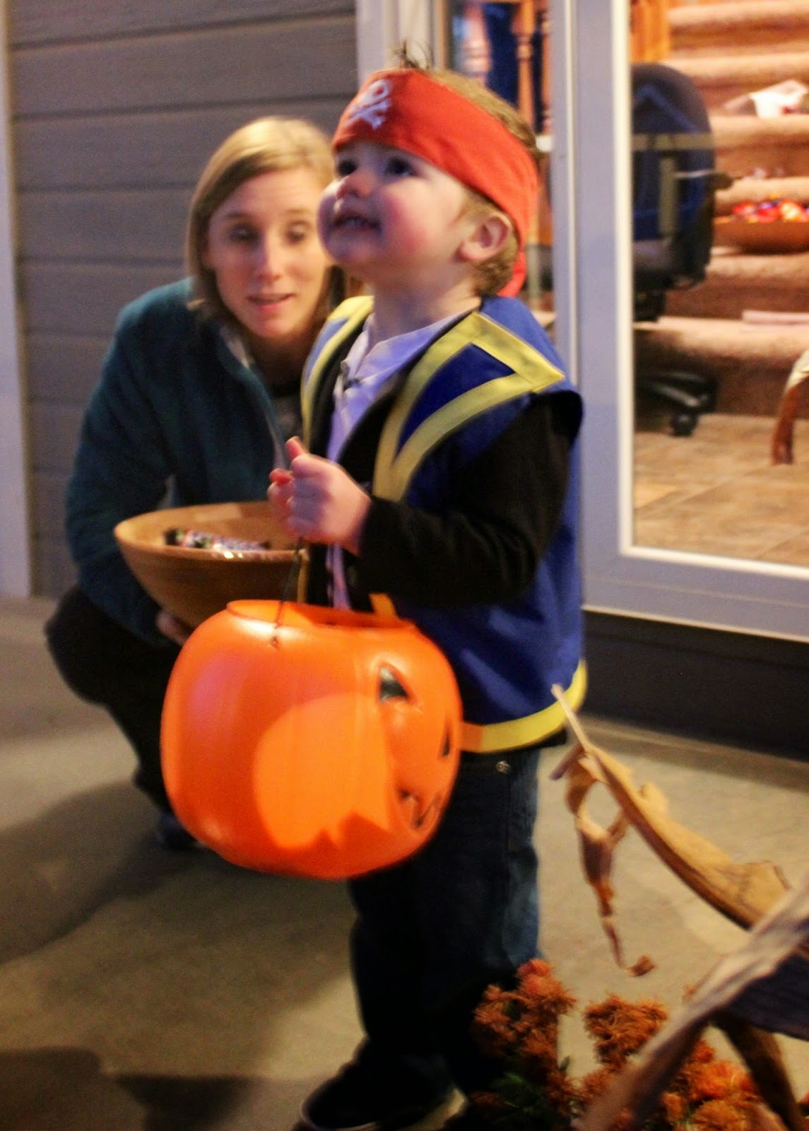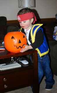 As we all know, second children don’t get much new stuff, so Holden just rewore Brandon’s first Halloween costume. Problem is, Holden is a much bigger boy than Brandon was. You can see that the costume ends right below his knee and his pajamas take over from there.