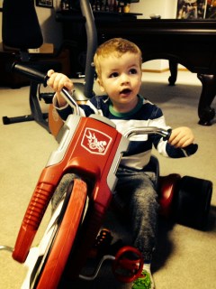 Scooting around on his bike in the basement. Steve asked Brandon if he remembered who got it for him and Brandon replied, “Santa Claus!” (it was actually from Grandma and Grandpa)