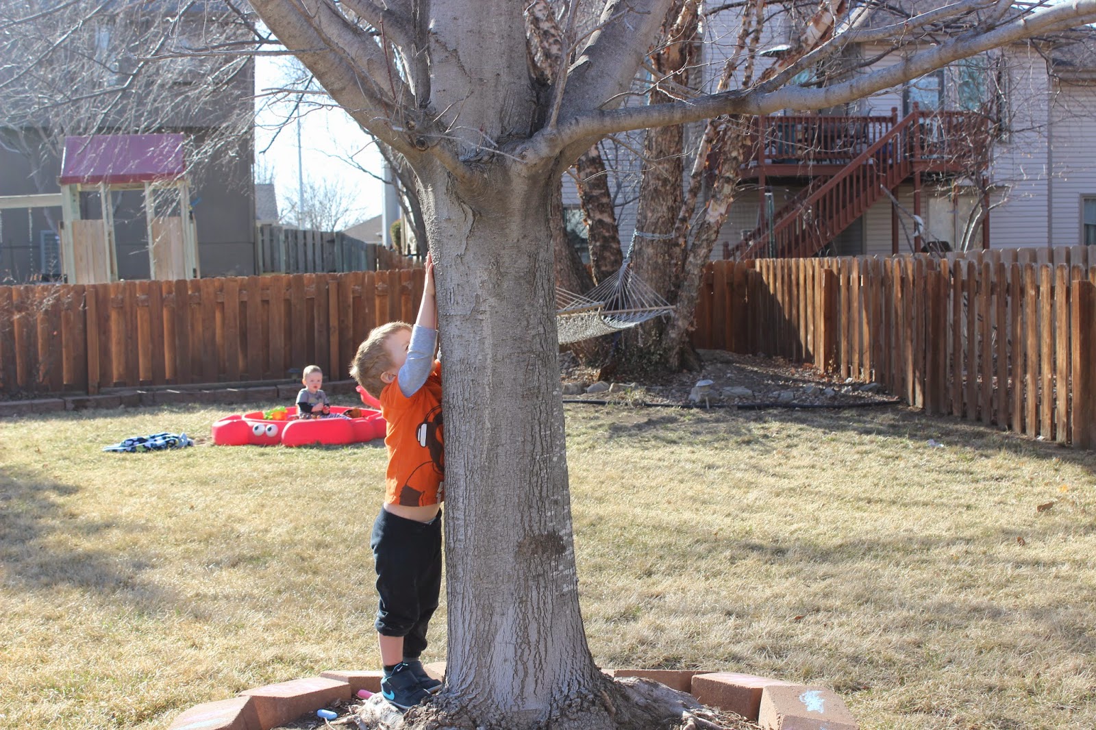 Brandon thinks he can climb trees. Luckily, it looks like I have a few more years.