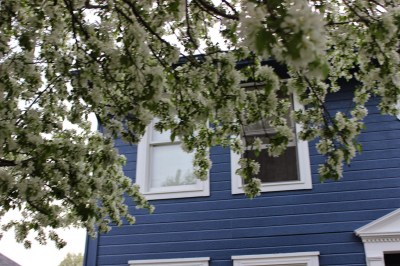 I love the color of my house next to our tree’s blossoms