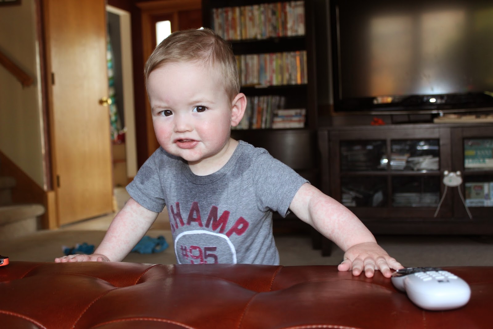 Holden was diagnosed with a double ear infection and put on Amoxicillin. Then he broke out in these red bumps that cover his body. I thought he was allergic to Amoxicillin like his mama, but the doctor said this is the virus interacting with the medication and it should go away. It’s still here and getting worse so I’m hoping it’s gone tomorrow.