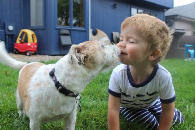 Brandon met my friend’s little chin-poo puppy on Friday and won’t stop asking for a dog of his own now. So I was glad to see a content moment with the dog we already own today.
