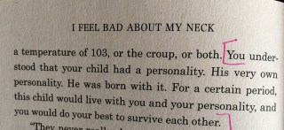 Nora Ephron explaining the difference between “being a parent” of her day and the active verb “parenting” of today has become. We try to cajole and prod our kids into certain people, and yes, we should enforce politeness and respectfulness. But I can not make my loud child into a quiet one, or my emotional one into a stoic one. After all, they are them, and I don’t want to screw that up.