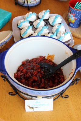 Then, for the food. We had baby carrots “for herbivores,” and what were supposed to be lil’ smokies “for carnivores.” However, the night before the party Steve discovered the lil’ smokies were expired so I made the same recipe with cut up hot dogs. Oops. Oh well, we all must learn to work with what we’ve got.