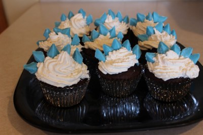I checked out the website of my favorite local cupcakery, but they didn’t have what I wanted either. So I used a Pinterest idea. It was just box cake mix, then I took a whip bag from the coffee shop I work at for the frosting. Then I used the points of candy stars I melted to make stegosaurus spikes. Wah-lah!