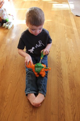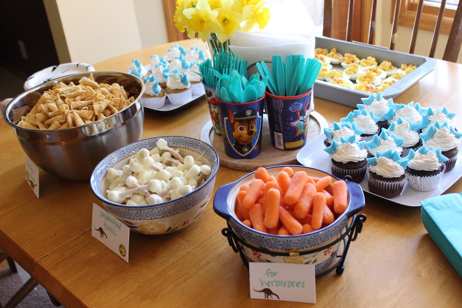 I also made deviled eggs (“dinosaur eggs”). There were bugels (“dinosaur toenails”) and I also made some “unidentified fossils” (mini marshmallows on the ends of pretzel sticks dipped in candy).
