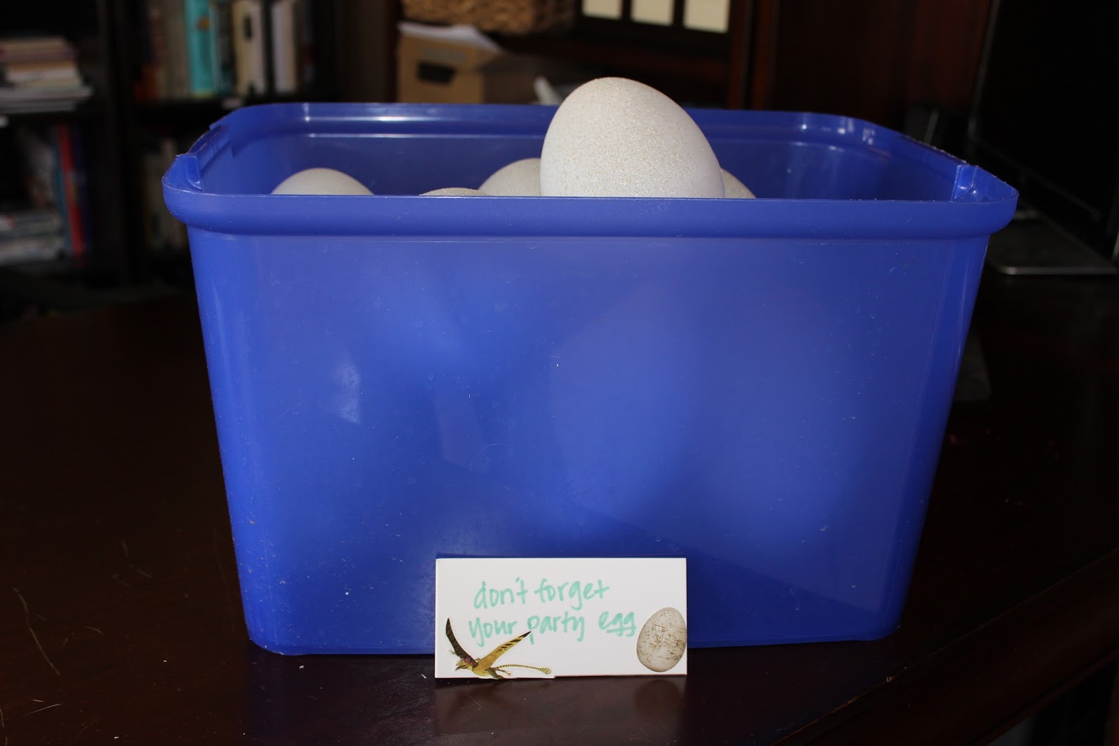 Then I prepared the giveaways. Instead of party bags, I made party eggs. I bought those giant plastic Easter eggs from Michael’s and spray painted them: first white, then with this textured speckle spray. Then I filled them with little dinosaurs, candy and play-doh.