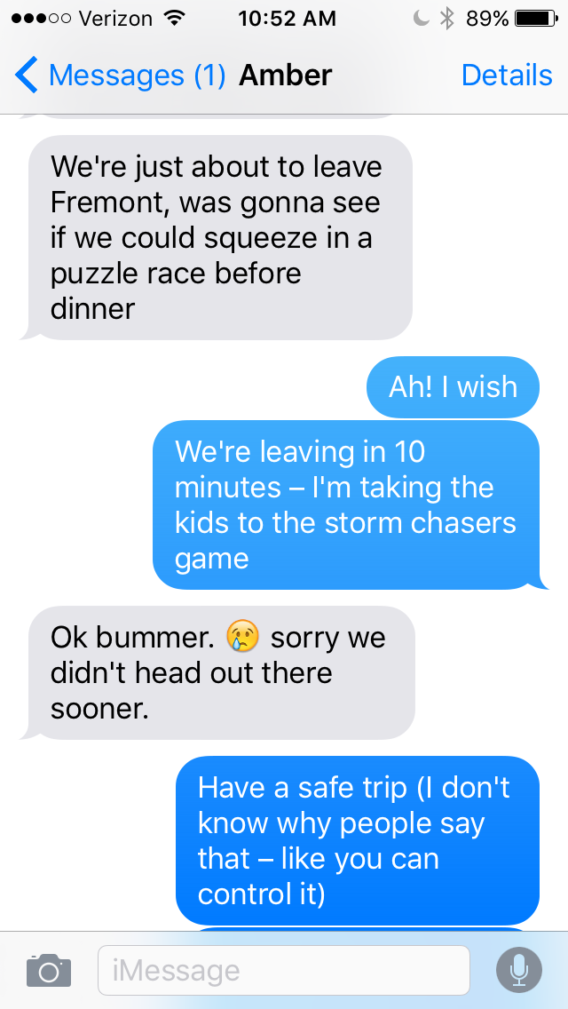 We raced a few more times, but I never beat her again. Then, she had to go about her other responsibilities, life and family and all of that while here in town. Right before she left, she texted me:
