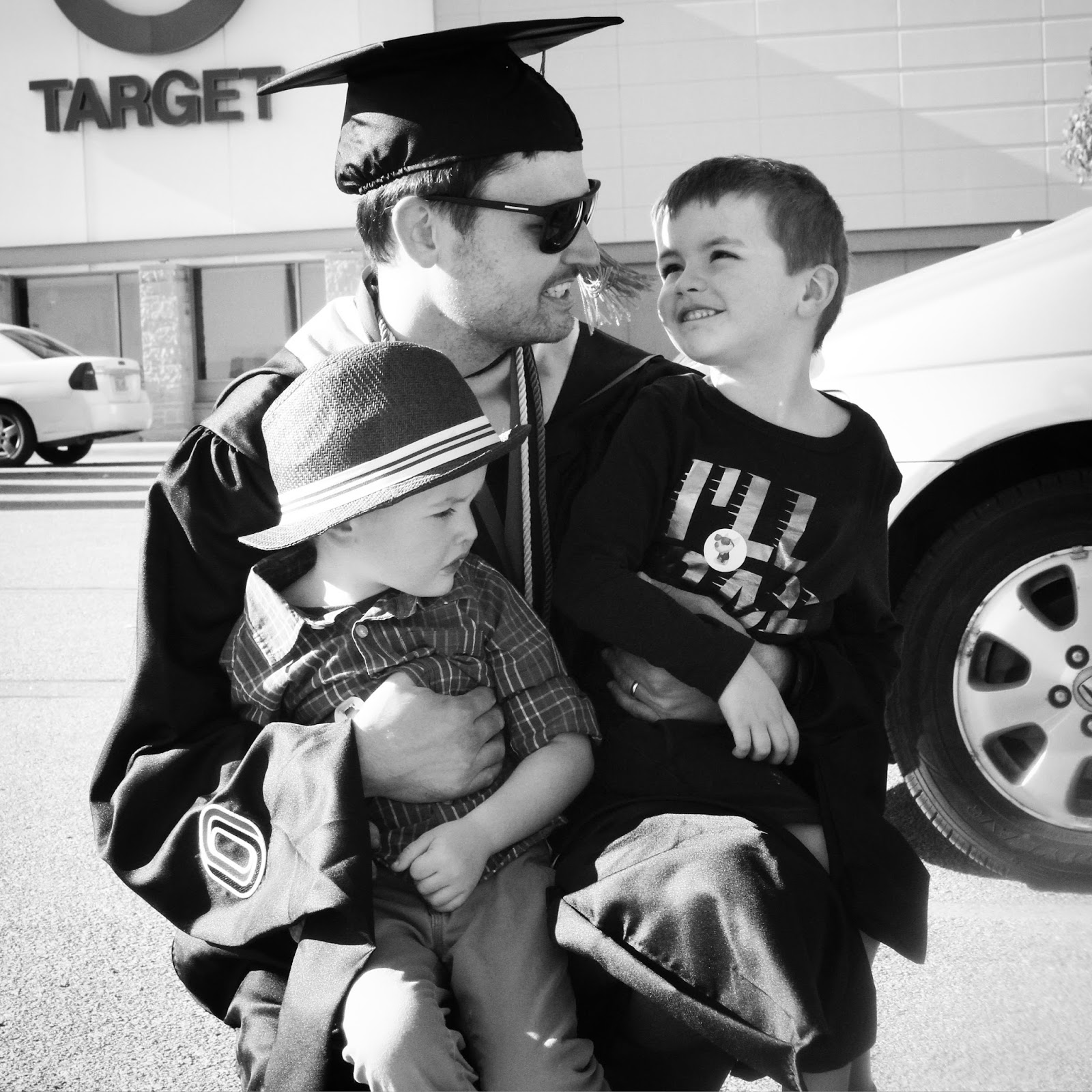 We did leave a bit early, after dad’s name, because it wouldn’t end. We went to Target. Dad came and met us. We broke into smiles, seeing him in his full graduation gear.