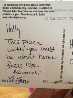 That’s what residency is like, but with life crossover. It’s a week of intense friendship. There is constant camaraderie with people who get you, people like you. “Our tribe,” we call it. We spend a lot of our time in lectures and readings in this conference room in the Lied Lodge. In the center of the room, above the fireplace is inscribed a quote by Thomas Jefferson: I never before knew the full value of trees. Under them I breakfast, dine, write. read, and receive my company.