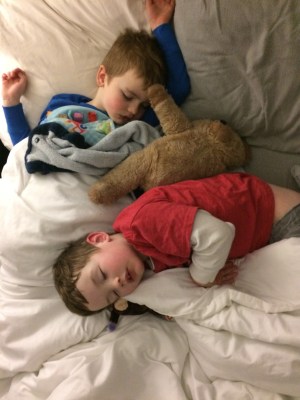 Jumping on the trampoline and playing with their cousins wiped the boys clean out.