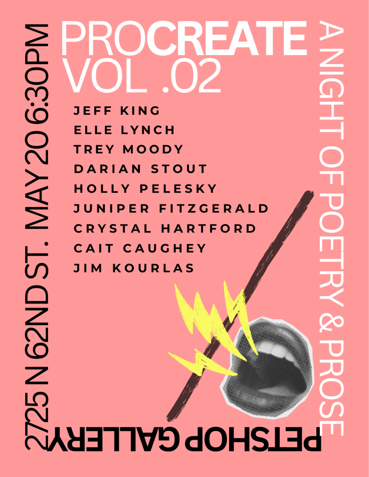 Wednesday, May 20, 2026 @ 6:30p → Reading poetry at Petshop Gallery as a part of the Procreate series → 2725 N 62nd St → Omaha, NE